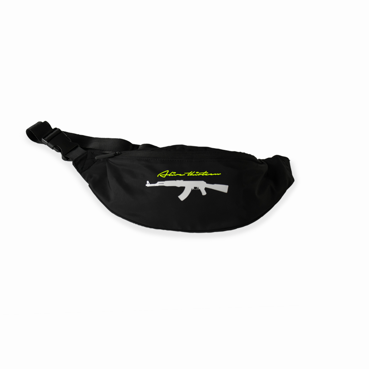 Alive thirteen AK47 Bauchtasche. Mit einem Alive thirteen Schriftzug in Neongelb und mit einem AK47 Design in Weiss unten drunter. Auf der anderen Seite am Reisverschluss ist die Tasche mit einem Alive thirteen Schriftzug in Weiss.