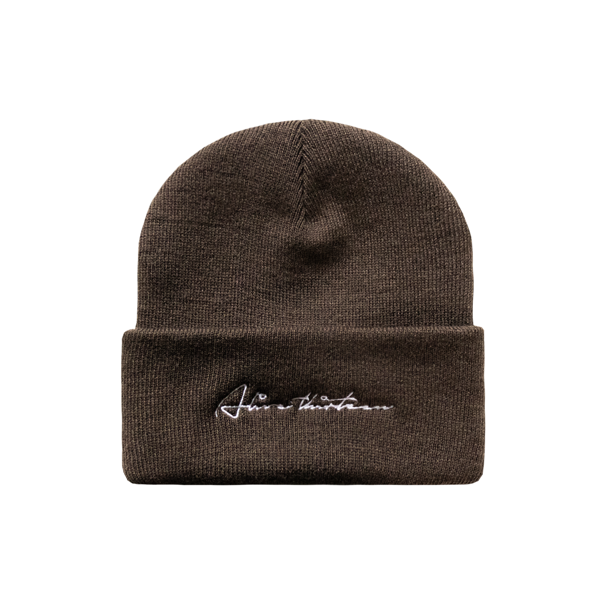Alive thirteen Beanie. Braun mit einem Alive thirteen Schriftzug bestickt in Weiss.