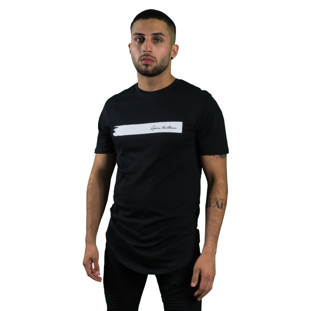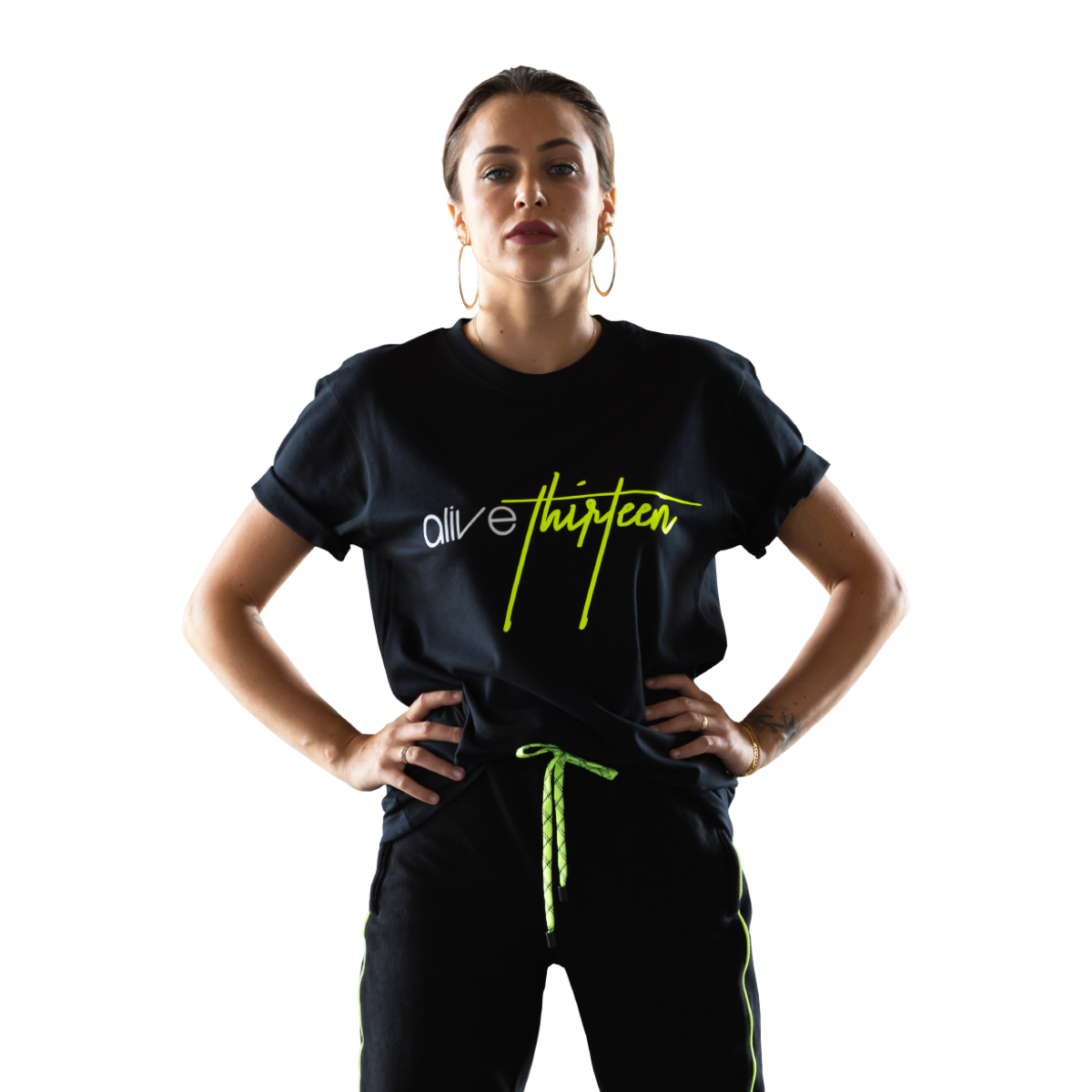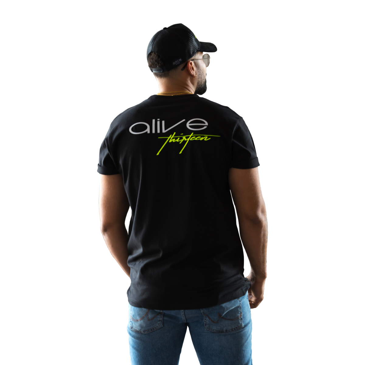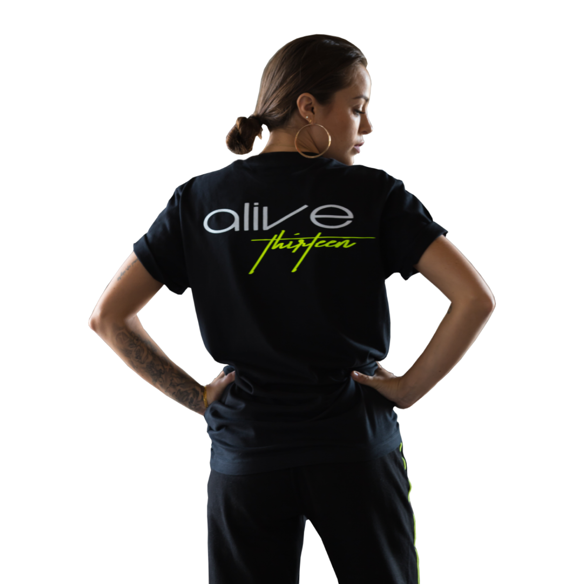 T-Shirt mit einem Alive Schriftzug in Weiss Diamond Glitzer und einem Thirteen Neon Yellow Schriftzug auf Brusthöhe.