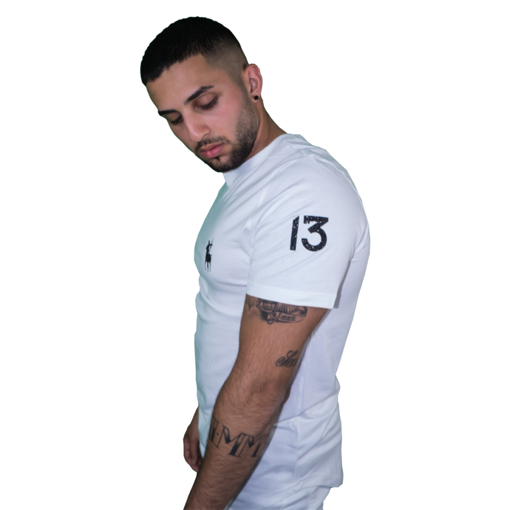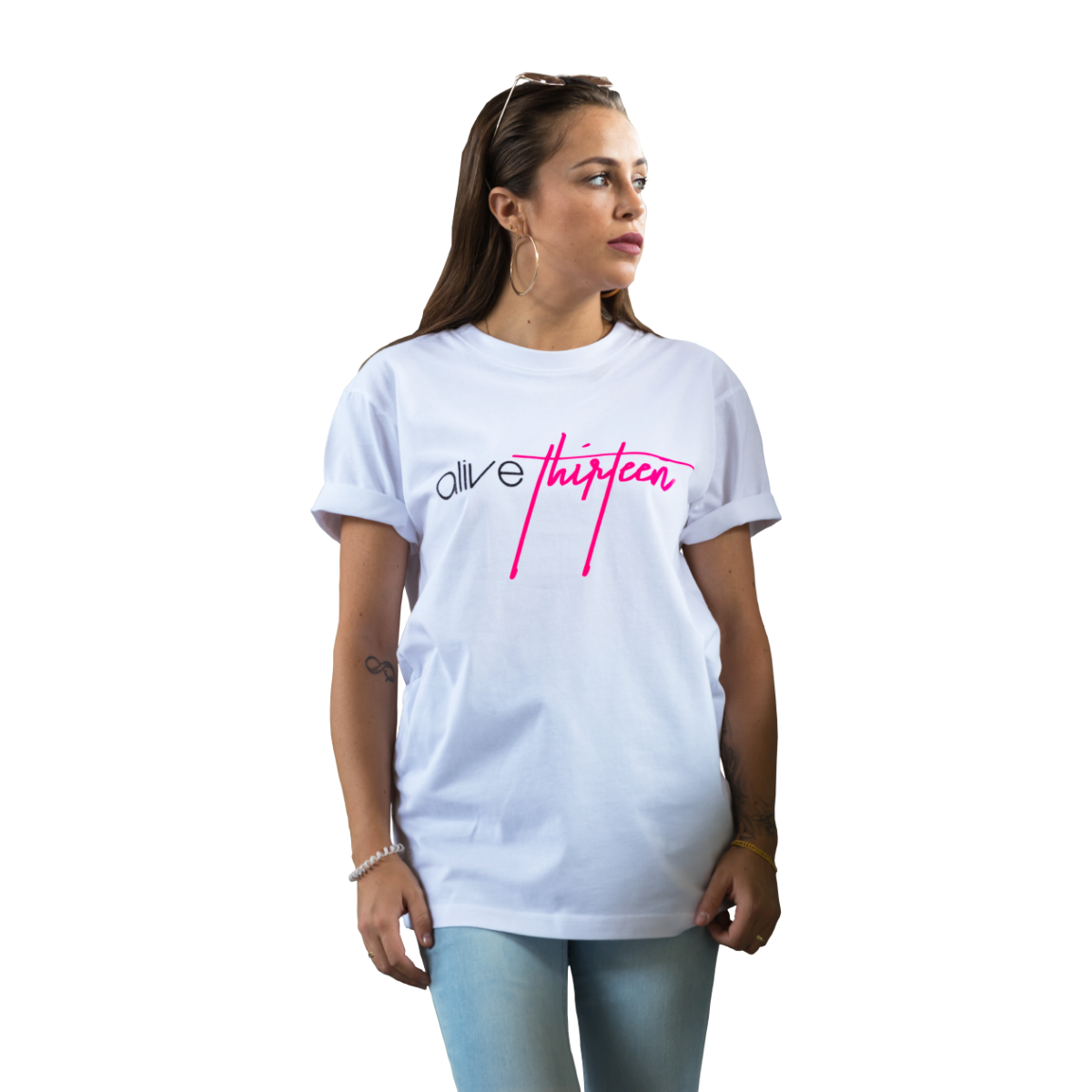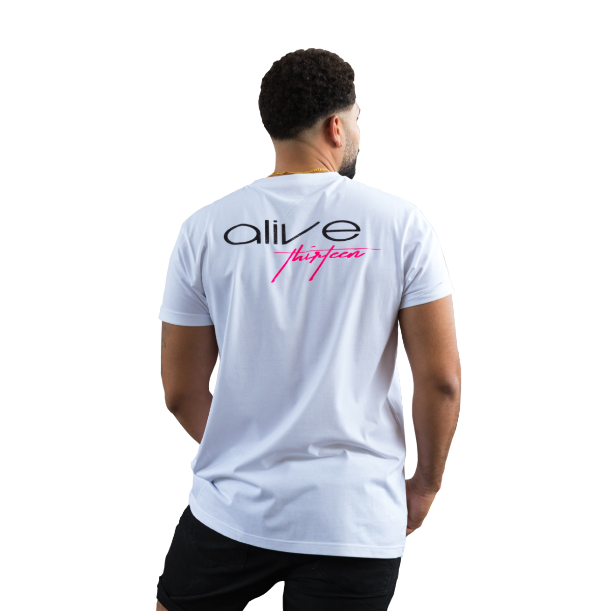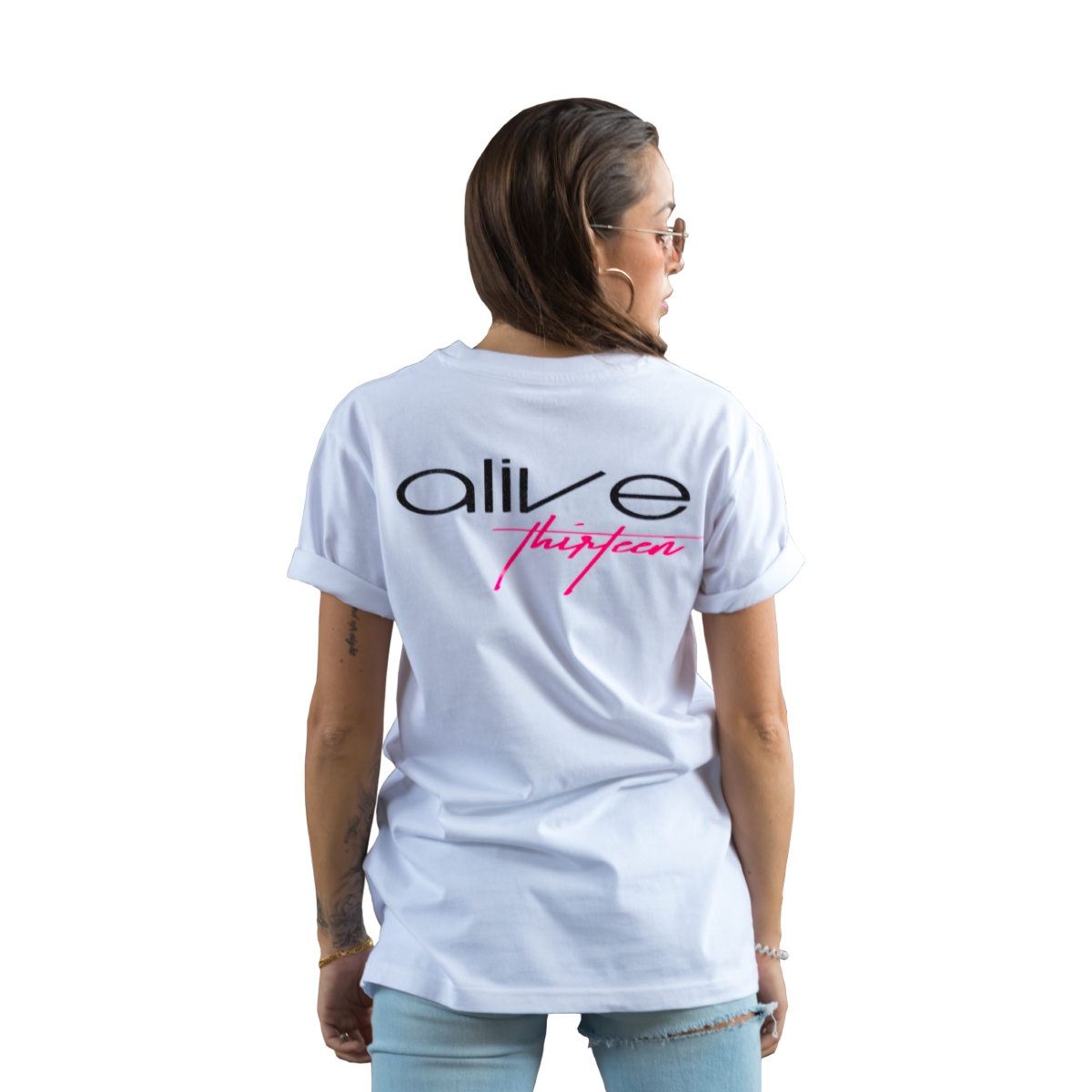 T-Shirt mit einem Alive Schriftzug in Schwarz Diamond Glitzer und einem Thirteen Raspberry Schriftzug auf Brusthöhe.